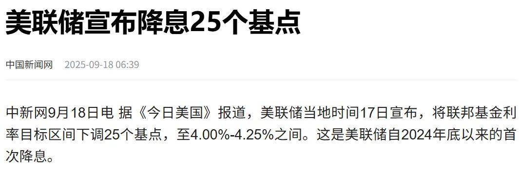 当地时间9月17日,美联储决定将联邦基金利率目标区间下调25个基点,至4.00%-4.25%之间。这是美联储自2024年12月以来的首次降息。