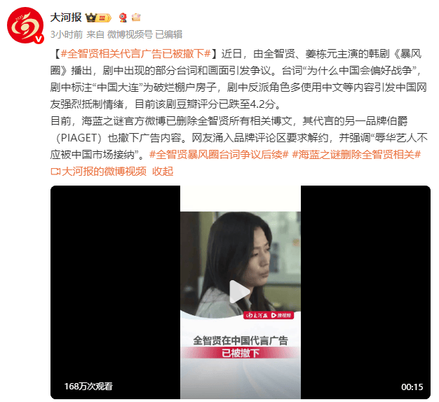 目前,海蓝之谜官方微博已删除全智贤所有相关博文,其代言的另一品牌伯爵(PIAGET)也撤下广告内容。网友涌入品牌评论区要求解约,并强调“辱华艺人不应被中国市场接纳”。