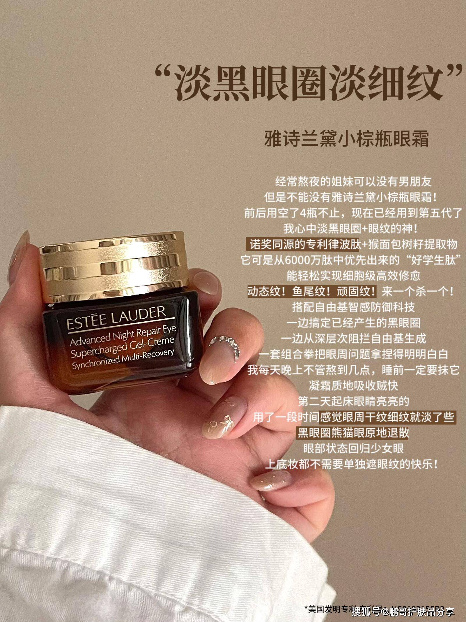 经常熬夜的姐妹可以没有男朋友,但是不能没有雅诗兰黛小棕瓶眼霜,前后用空了4瓶不止,现在已经用到第五代了,我心中淡黑眼圈+眼纹的神。