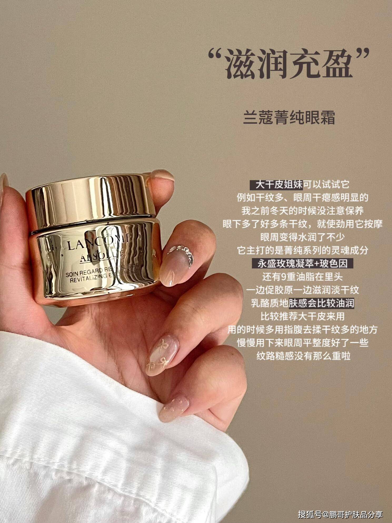 大干皮姐妹可以试试它,例如干纹多、眼周干瘪感明显的,我之前冬天的时候没注意保养,眼下多了好多条干纹,就使劲用它按摩,眼周变得水润了不少。它主打的是菁纯系列的灵魂成分,永盛玫瑰凝萃+玻色因,还有9重油脂在里头,一边促胶原一边滋润淡干纹。