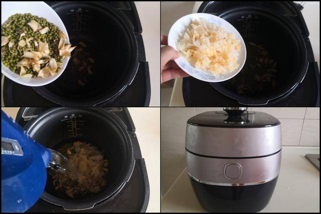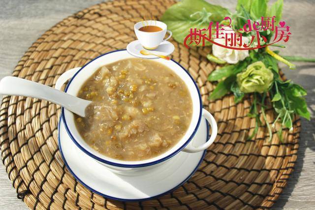 制作过程: 将绿豆和干百合洗净后放入电炖锅中; 将干银耳泡软后剪成小碎粒, 越碎越容易出胶,将准备好的银耳碎粒放入电炖锅中,加入适量的水,按下电炖锅上炖煮甜品的功能键, 炖煮好后按个人口味加入少许冰糖融化即可。