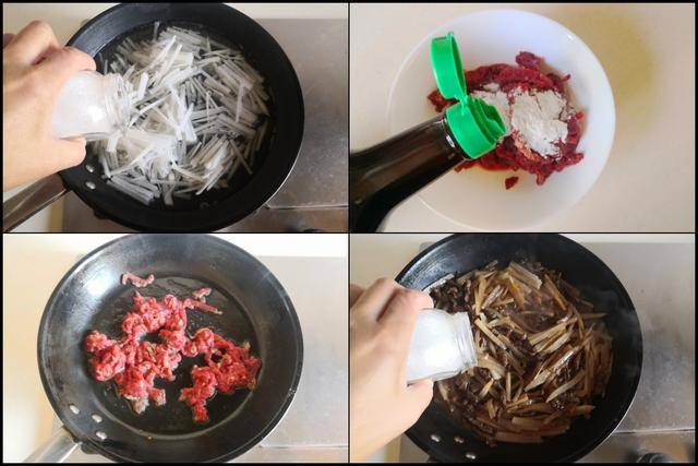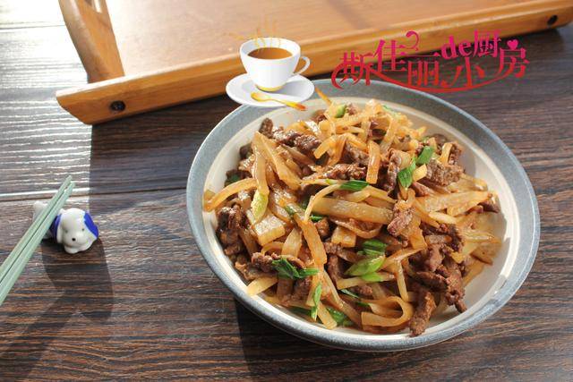 制作过程: 提前将牛里脊肉和白萝卜切成细丝备用。 烧锅水加入1小勺盐,将白萝卜放进锅中焯煮至微微透明后捞出备用。牛里脊肉丝加入少许盐、料酒、淀粉和姜末等调味料拌均匀腌制3分钟备用。烧热锅放入适量的油, 将腌制好的牛肉丝放进锅中翻炒至变色,加入焯好的白萝卜丝放进锅中翻炒几下,加入1勺生抽上色, 再加入少许盐调味,盛入钵中,撒上少许葱花即可。