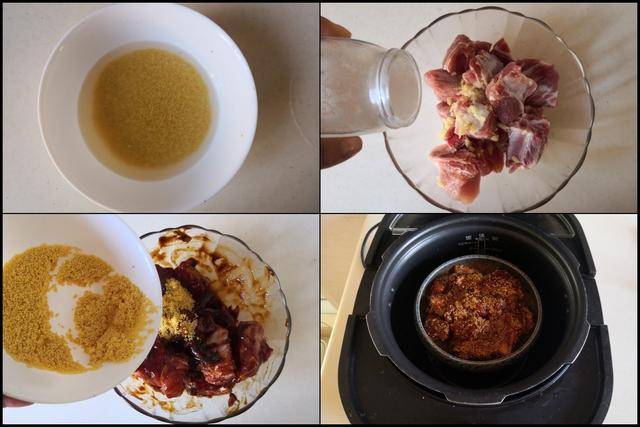 制作过程: 提前将小米用水泡上二十分钟; 选用肋排切成麻将大小的块,加入少许盐、料酒、生抽、淀粉、蚝油和姜末等调味料拌均匀腌制十分钟。 将泡好的小米沥干水分后放入腌制好的排骨中。 烧锅水,将小米排骨菜盘放进蒸锅中,大火蒸上半小时将其蒸熟后拿出来,撒上少许葱花即可。