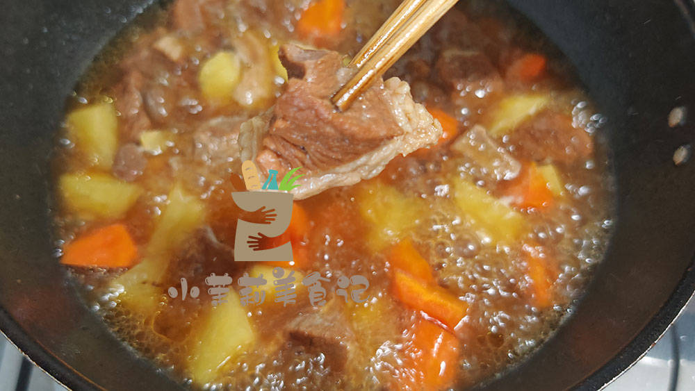 4、接着准备些菜倒进去,土豆,胡萝卜很经典,届时再补点盐,火候大一些,炖二十分钟,全部软烂后关火。