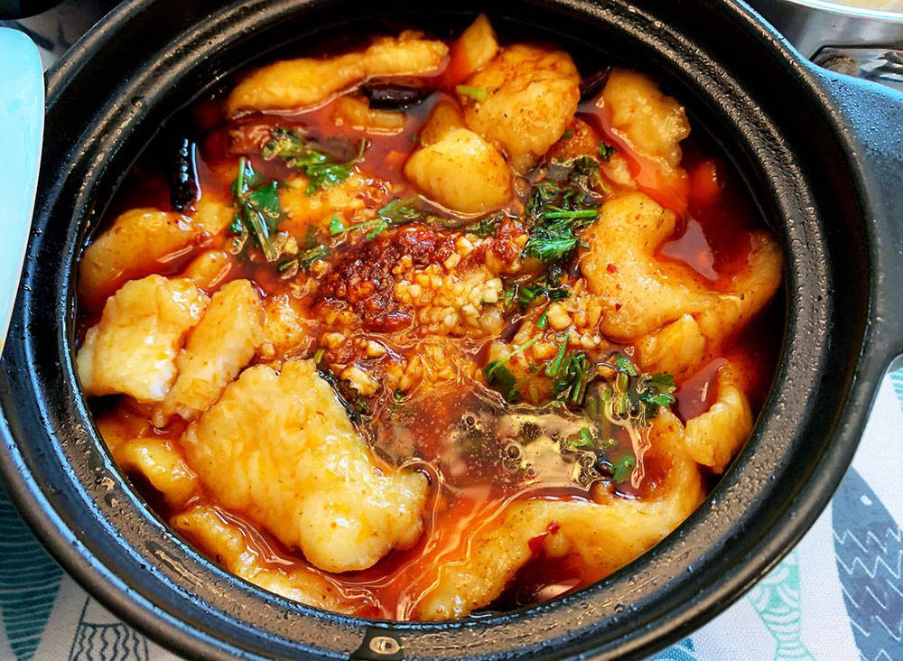 4、另外在砂锅底部码上一层嫩豆腐,鱼块也放进去,炒好的汤汁倒在里边,继续咕嘟几分钟,令其入味。最后加些蒜蓉,粗辣椒粉,香菜段,淋个热热的油到里边,香味升腾出来,即可上桌。其它的鱼也可以这样做。