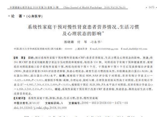[1]郭晓璐,付琴,刁永书.系统性家庭干预对慢性肾衰患者营养情况、生活习惯及心理状态的影响[J].中国健康心理学杂志,2018