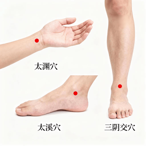 3. 三阴交(小腿内侧):健脾滋阴。