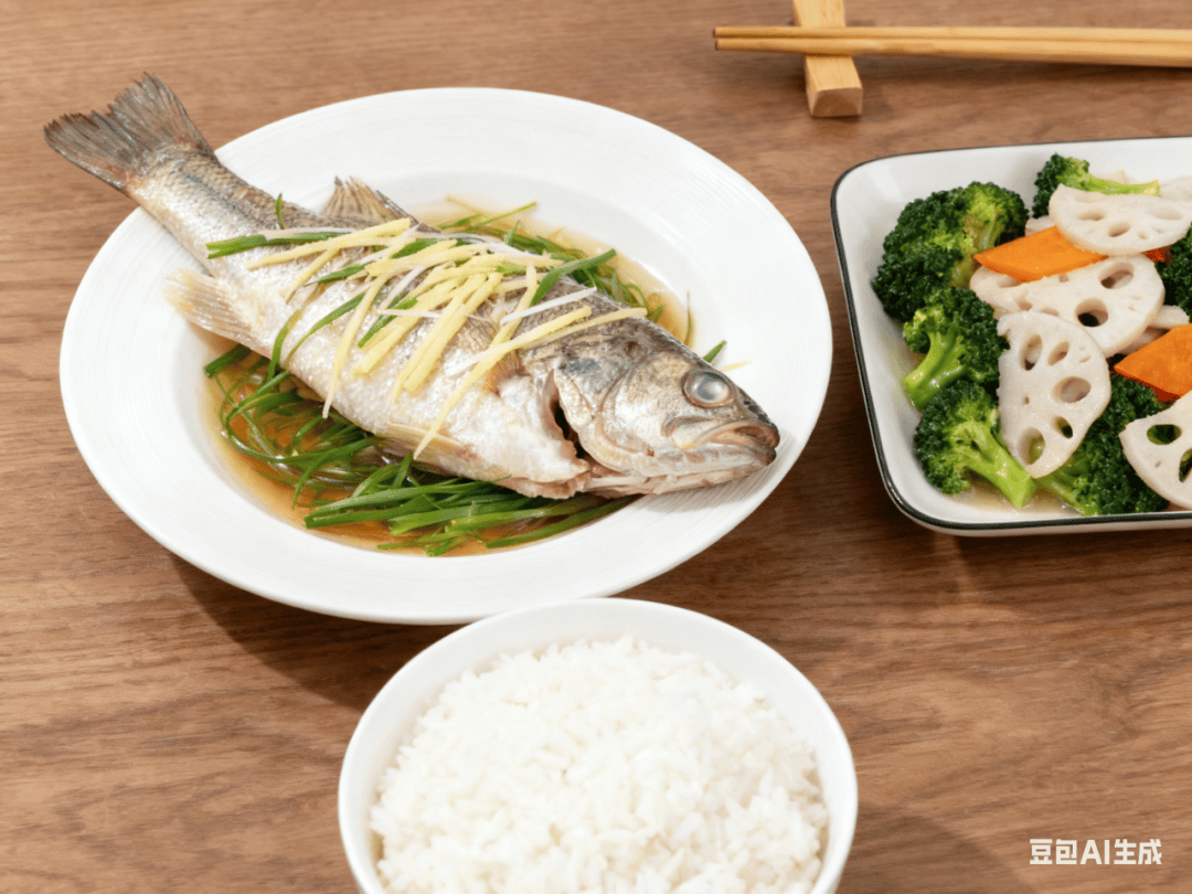 午餐:米饭 + 清蒸鲈鱼 + 时蔬炒莲藕。