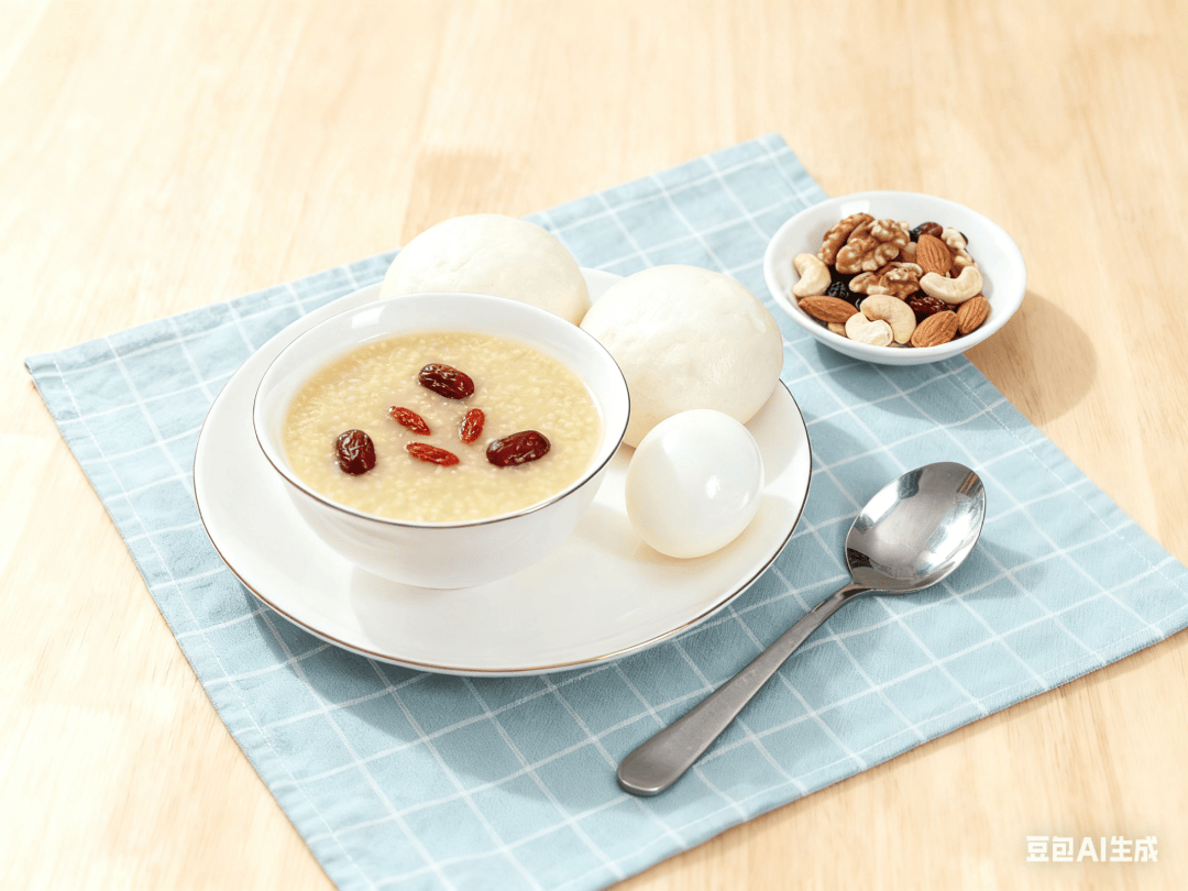 早餐:山药小米红枣粥 + 全麦馒头 + 煮鸡蛋 + 适量坚果。