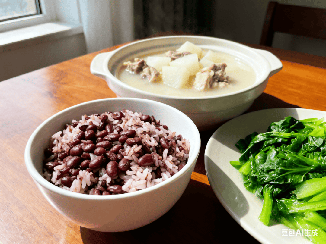 晚餐:红豆饭 + 萝卜老鸭汤 + 时令绿叶蔬菜。