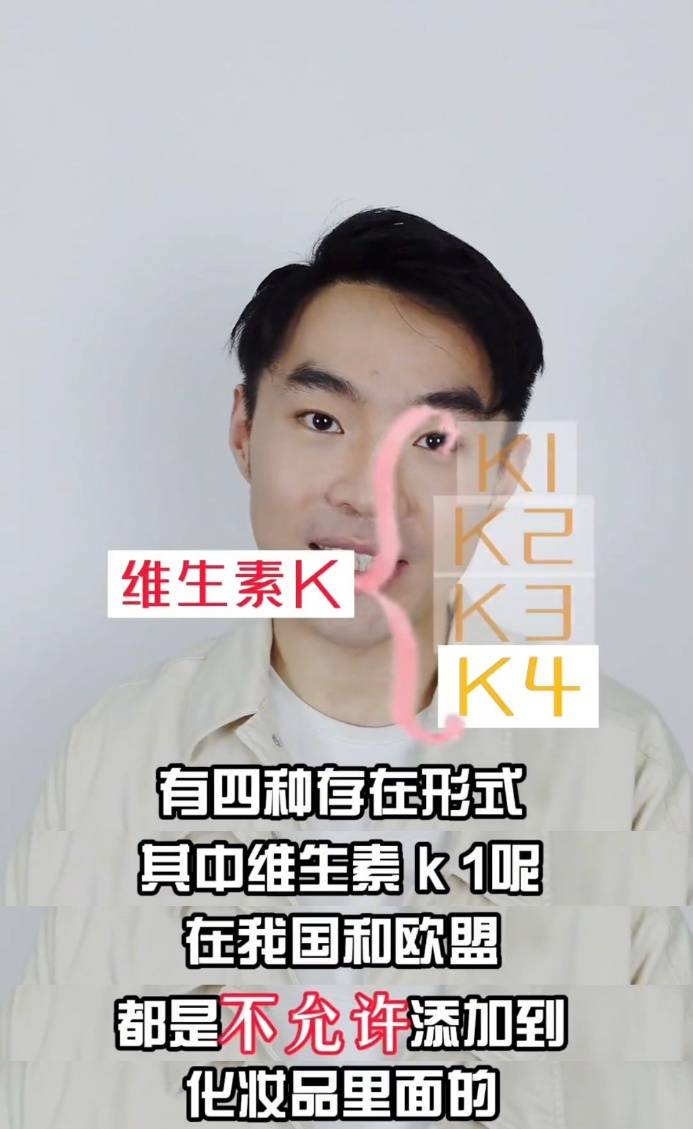 因为其实只要有保湿成分就能向往向上做一个淡化报告。关于维生素K有四种存在形式,其中维生素K1在我国和欧盟都是不允许添加在化妆品里面的。