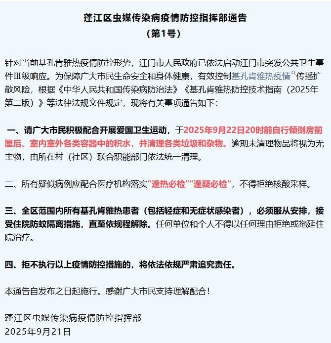 9月21日,据广东省江门市蓬江区虫媒传染病疫情防控指挥部消息,江门市人民政府已依法启动江门市突发公共卫生事件Ⅲ级响应。根据通告内容,相关事项如下:
