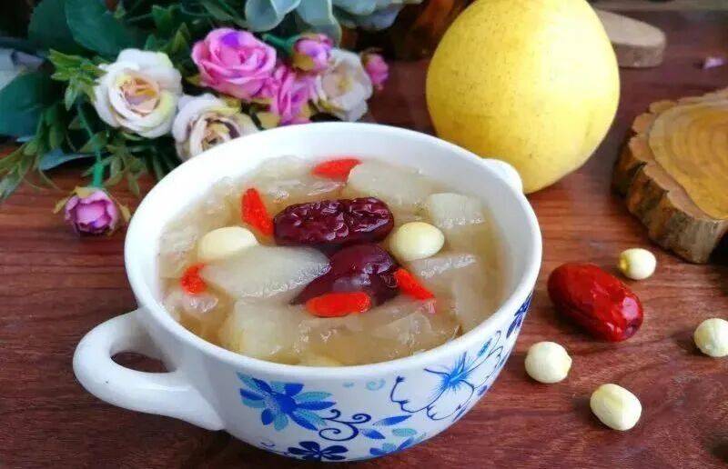 雪梨1个、银耳30g、莲子20g、红枣5枚。雪梨去皮切成块,银耳一朵、莲子若干和红枣10余粒泡发洗净。雪梨、银耳、红枣、莲子和冰糖适量放入锅中,加足量清水(水量大约是所有食材的2-3倍),大火炖开后转小火1小时即可。