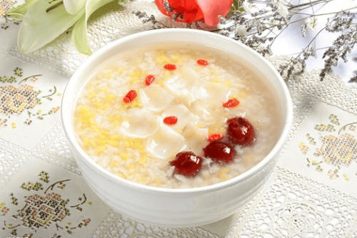 百合5克、枸杞10克、大枣10枚、莲子1两、大米适量,加适量水熬粥。