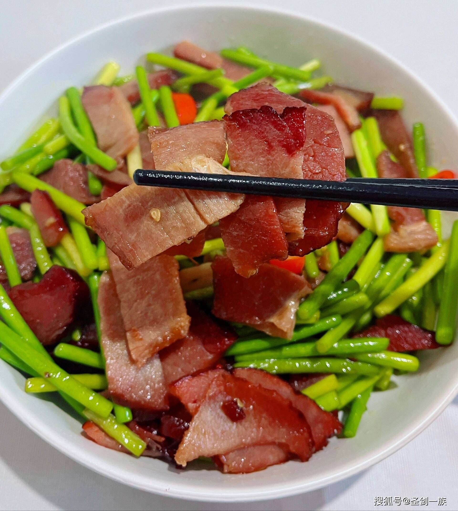 【食材】腊肉、蒜苔、干辣椒、葱姜蒜、生抽、盐、鸡精、花椒、食用油