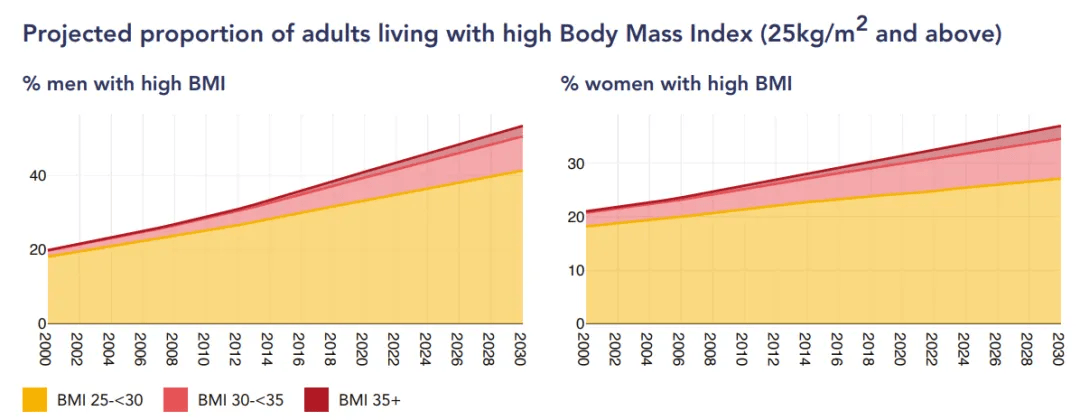 如今的体重问题早已不是“爱美需求”那么简单,世界肥胖联盟2025年数据显示,自2010年以来,中国高BMI(BMI≥25kg/m2)成年人口比例呈增长趋势,其中高BMI成年人口占比为41%(约4.6亿人)、肥胖患病率为9%,预计到2030年,中国高BMI成年人口数将达到5.15亿。