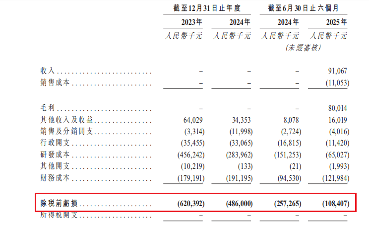 首先是钱袋子的压力,生物医药是出了名的烧钱行业,一款新药平均要花23亿美元、用12.5年才能做出来,临床成功率还不到10%。先为达目前还没有产品上市卖钱,2023年、2024年的营收都是0,2025年上半年靠授权合作拿到9106.7万元收入,两年半累计亏损已经超12亿元。