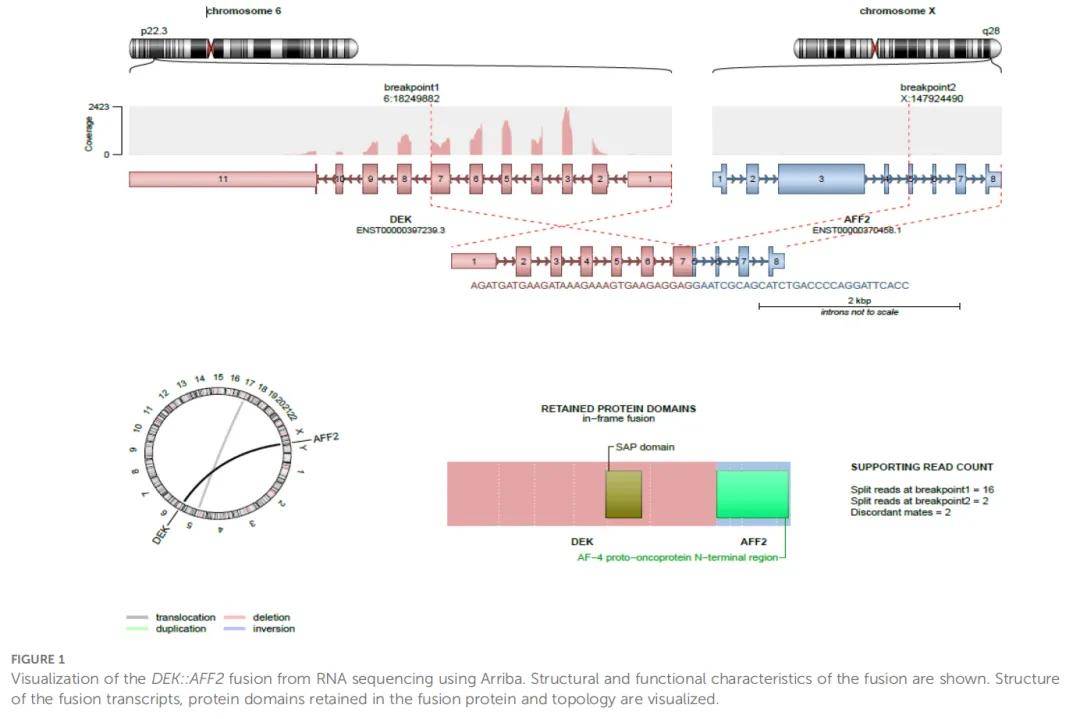 ▲图1 使用Arriba软件对RNA测序结果中的DEK::AFF2融合蛋白进行可视化