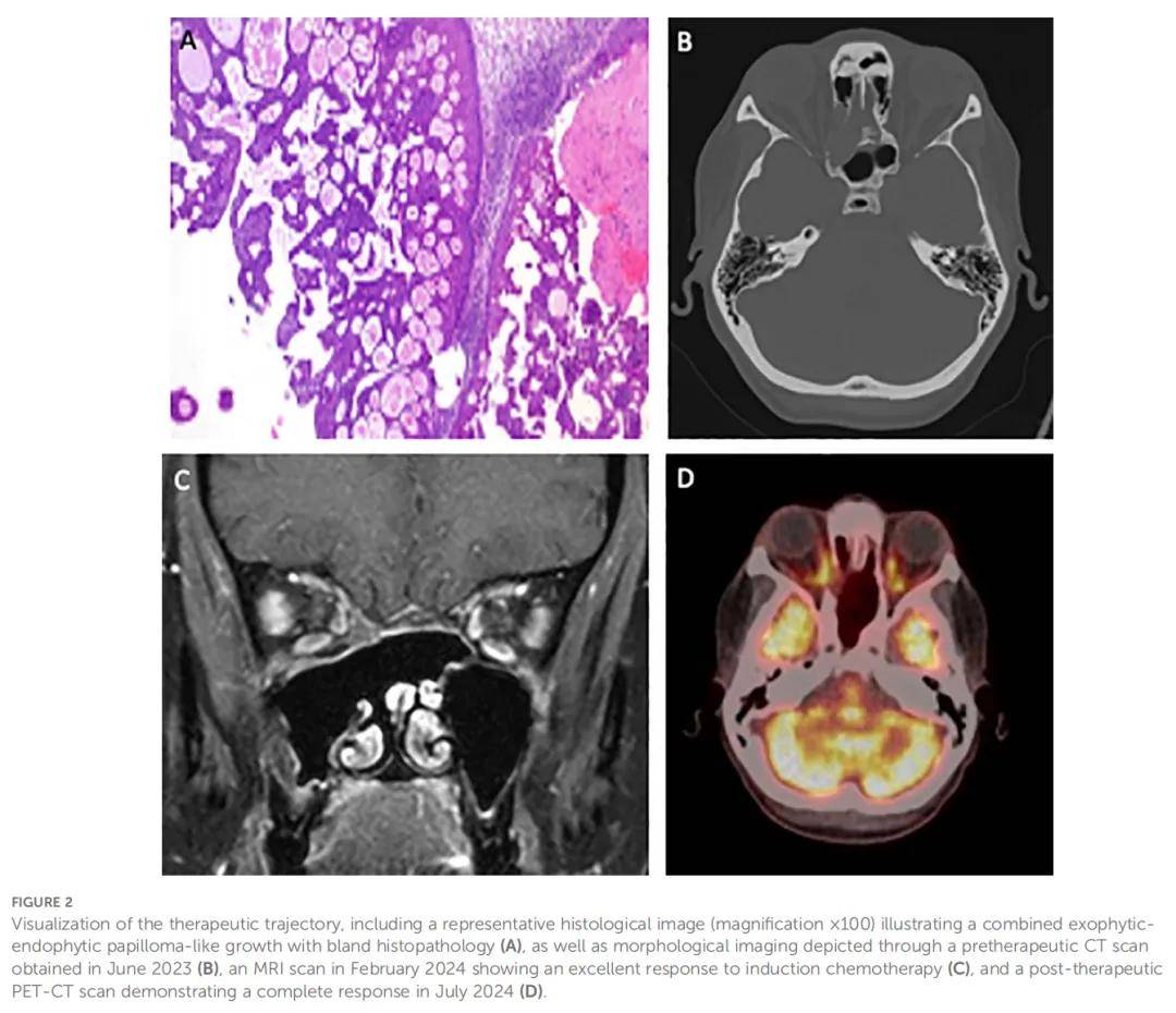 由于未检测到淋巴结受累或远处转移,多学科肿瘤委员会提出的初始治疗策略侧重于新辅助治疗。患者计划接受三个周期的吉西他滨联合顺铂治疗,旨在通过神经外科与耳鼻喉科联合手术方案实现R0切除。然而,2024 年 2 月,MRI再分期显示诱导化疗完全缓解(见图2C)。鉴于这一首次报道的显著应答,治疗方案调整为根治性初始放化疗(CRT)。该方案包括五个周期的顺铂联合靶向放疗,放疗范围包括鼻窦、部分眼眶受累区域及双侧II、III区淋巴引流区。2024 年 7 月的随访影像学检查(PET-CT,见图2D)显示DEK::AFF2融合相关鼻窦癌完全代谢缓解。此后,患者纳入定期肿瘤学监测,截至目前无疾病复发证据。