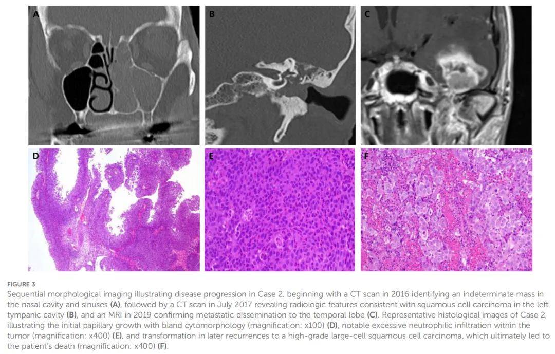 由于鼓室病变切除不完整,遂采用耳内及耳后联合入路进行肿瘤减瘤术。尽管进行了此次干预,2017 年 8 月的常规耳镜随访发现左侧外耳道疑似内翻性乳头状瘤复发。此外,在修正性外耳道手术中发现腮腺区域有一可疑淋巴结,并将其切除。对切除组织的组织病理学评估证实存在侵袭性鳞状细胞癌(SCC)。这些发现提示左侧外耳道内翻性乳头状瘤发生恶性转化,同时伴有淋巴结转移(见图3D-F)。2017 年 12 月,患者接受了修正性鼻窦手术和修正性外耳道手术。组织病理学分析证实外耳道和鼻道均存在鳞状细胞癌。修正性手术后,患者于 2018 年 1 月至 3 月接受辅助放化疗,总剂量为 63 戈瑞,同步给予顺铂。治疗靶区包括左侧鼻腔、左侧上颌窦、左侧外耳道及同侧颈部淋巴结。2019 年 4 月,患者出现左侧乳突区持续性慢性疼痛,左侧外耳道及乳突区新发现可疑肿块,并新发面神经麻痹。这些发现促使决定进行修正性手术,组织病理学检查显示低分化非角化型鳞状细胞癌复发。MRI显示复发病灶及左侧颞叶新发病变(见图3C)——高度提示转移伴中线移位——促使决定采取耳鼻咽喉科与神经外科联合干预。2019 年 11 月,患者接受左侧腮腺切除术、舌下神经跨接吻合术及颞叶转移灶切除术。术后病程因并发海绵窦血栓形成而复杂化,需长期重症监护治疗。2020 年 1 月,患者因该病去世。对 2019 年 4 月手术中获取的福尔马林固定石蜡包埋(FFPE)组织样本进行分析,重新解读为符合DEK::AFF2癌,随后通过检测DEK-AFF2融合予以证实,强调其在疾病侵袭性进展中的作用。