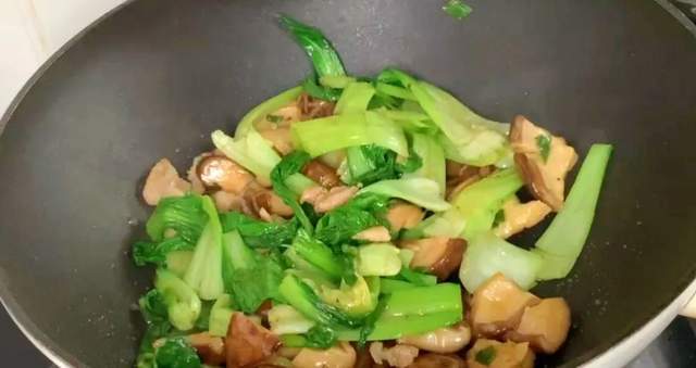 等香菇炒得差不多了,倒入油菜,快速翻炒均匀,最后加入生抽和盐调味,再翻炒几下就可以出锅了。