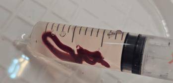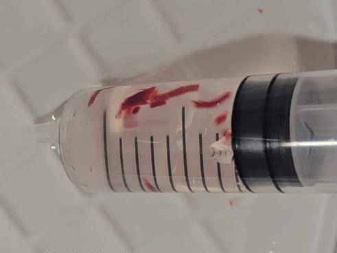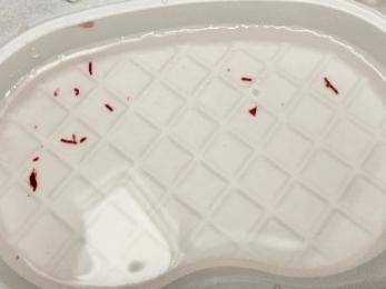 5)更换注射器内自来水,获得干净清爽的“虾线”血凝块。