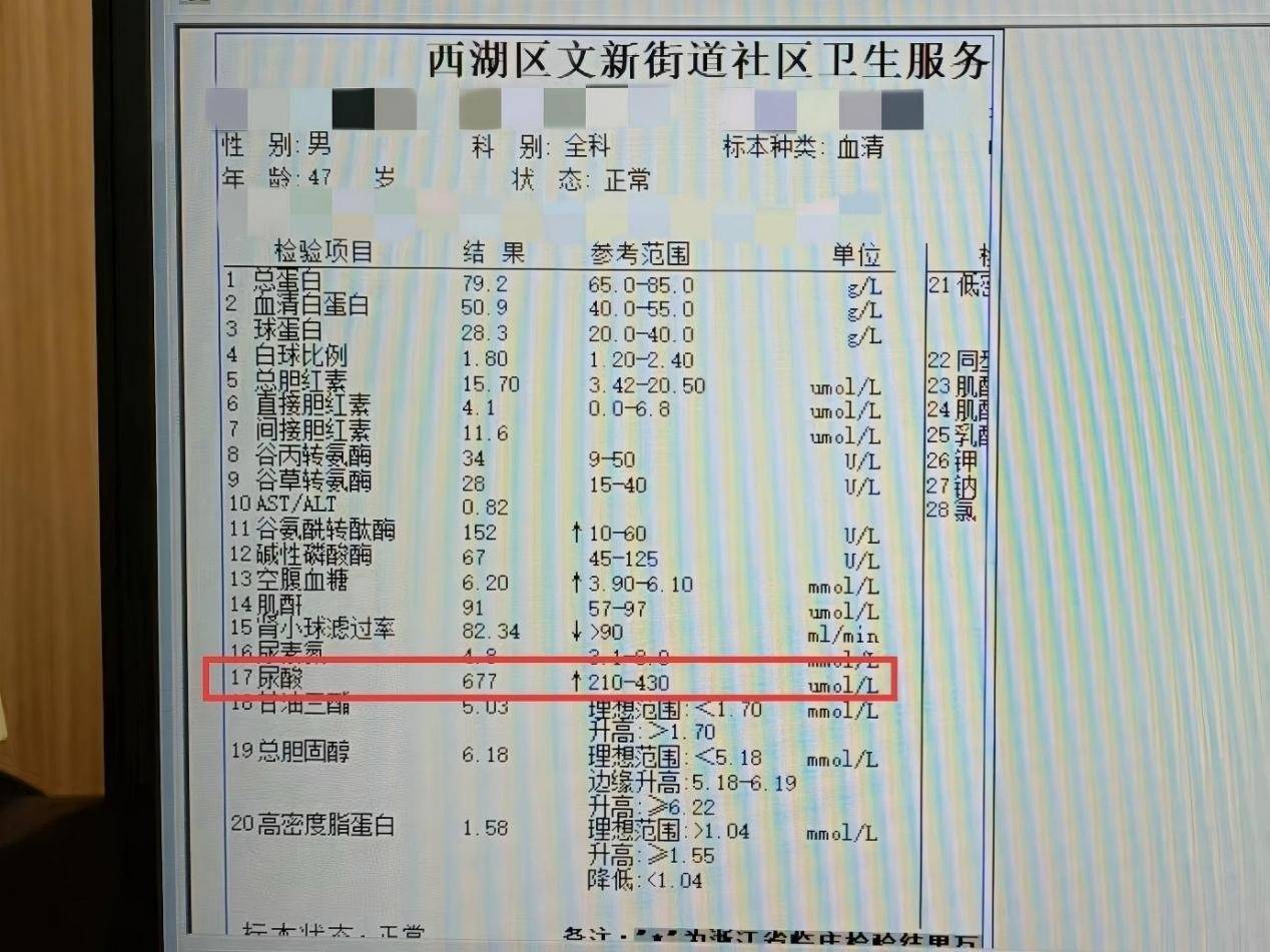 患者张先生(化名)是位中年职场人士,应酬多,夜宵配啤酒是常态。近日,他在一个午后突然感到右脚大脚趾剧痛难忍,局部又红又肿,几乎无法走路。赶到附近的文新街道社区卫生服务中心后,接诊的闫庆宇医生根据症状,高度怀疑是急性痛风性关节炎。检查结果印证了判断:张先生的尿酸值高达677μmol/L,远超正常范围。