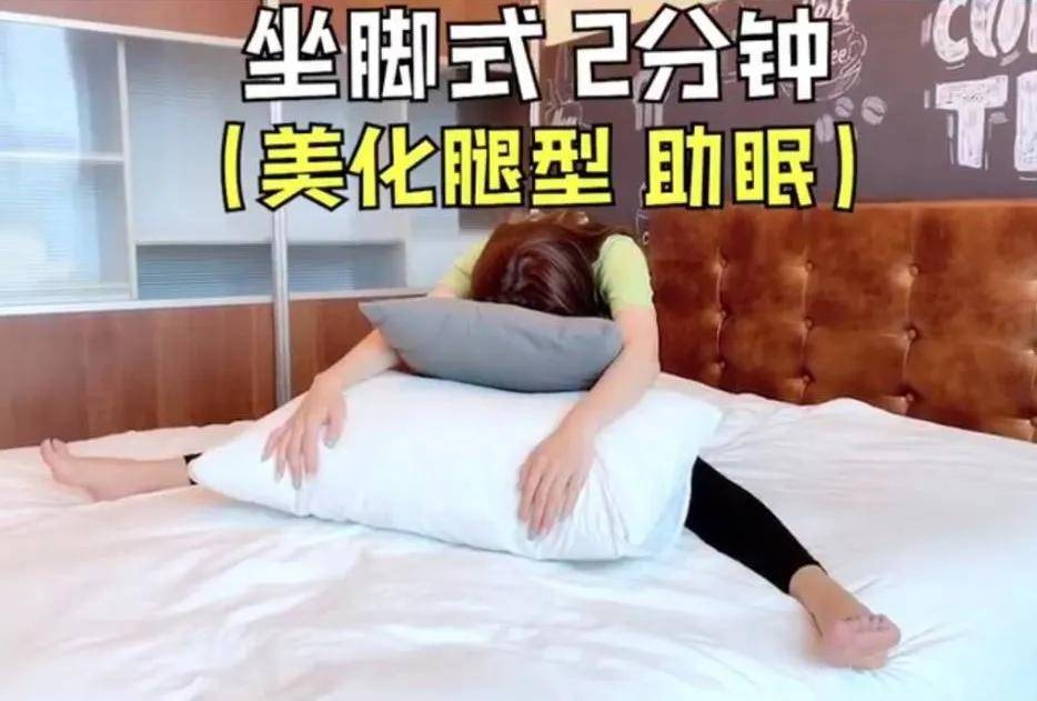 看到这个睡姿,小编还是不小心噗嗤笑出声~(根本是小编回家累倒在沙发的蠢样嘛~)睡眠瘦身操第二式:坐脚式,将双脚打开成V字形,同时在两脚间依照自己的筋骨软硬度搭配枕头的高度,就和运动后拉筋暖身般,缓缓将双脚向外伸展,持续2分钟,不仅能帮助小腿肌肉的放松达到美腿效果,还能舒缓你紧绷的神经,对睡眠也很有帮助喔~