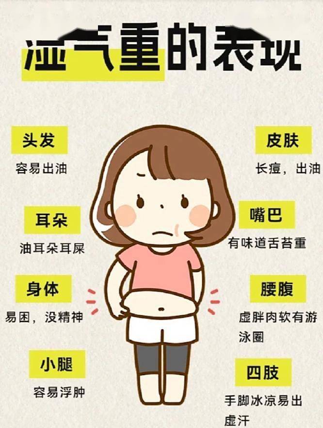 头部与四肢:晨起困倦、头重如裹(像裹着湿毛巾)、四肢沉重乏力。下午三四点异常困倦,小腿发酸发沉。