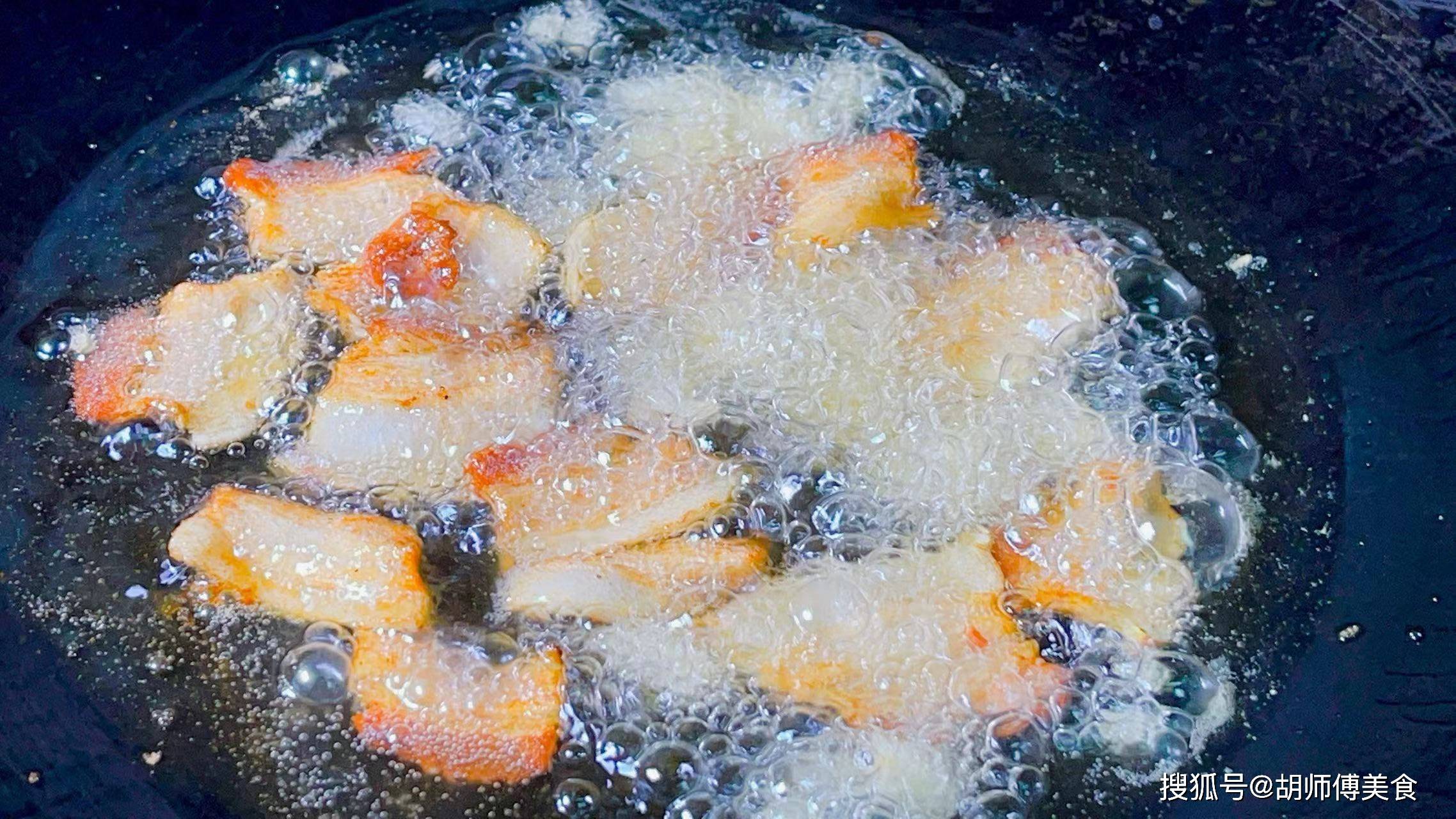 第四步:锅中放入适量油,然后把五花肉放入锅中,大火煸炒一会儿,直到将五花肉煸炒成金黄色,接着把姜末放入锅中炸几秒,这样可以去除五花肉中的腥味。