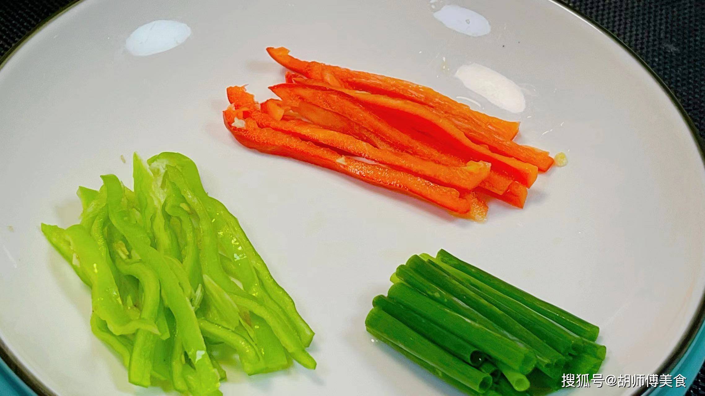 第三步:将青椒、红椒、香葱全部都冲洗干净,然后将青椒、红椒全部都切成细丝,接着再把香葱切成4-5厘米的小段备用。