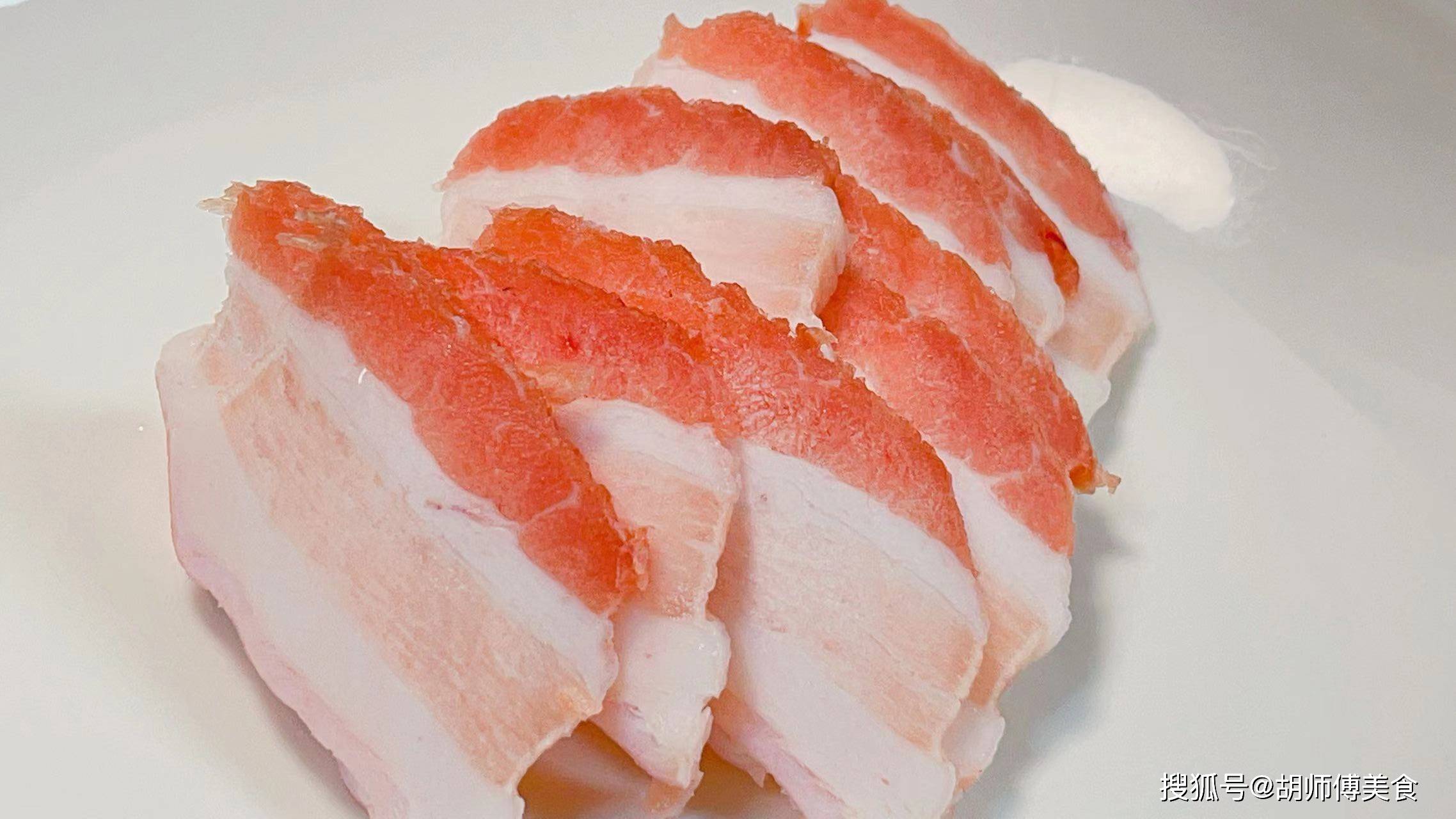 第二步:炒茶树菇的五花肉,尽量选择肥一点的,因为肥的五花肉中含有的油脂比较多,用它炒的茶树菇吃着会更香一点,把准备的五花肉去皮后洗净,然后把五花肉切成0.2厘米厚的薄片备用。