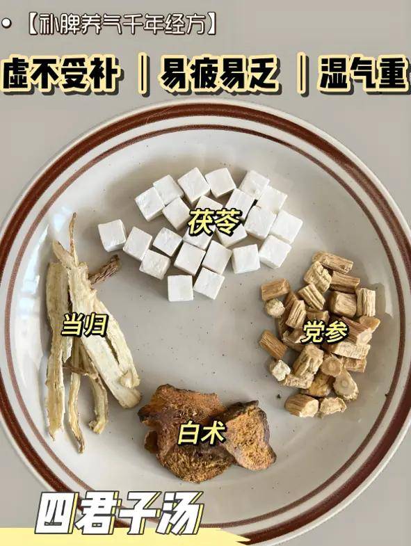 3、四君子汤:党参、白术(麸炒)、艾叶(炭)、炙甘草。出自宋代《太平惠民和剂局方》,具有补脾益气,强健脾胃,抵抗疲劳,充沛精力的作用。四君子汤算是最负盛名的古方剂之一。