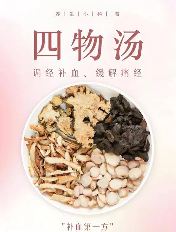 2、四物汤:当归、白芍(炒)、熟地黄、川芎。[四物汤]最早见于晚唐蔺道人著的《仙授理伤续断秘方》,到了宋代《太平惠民和剂局方》开始将它应用于妇产科疾患,成为补血调经的基础方。由于治疗妇科疾病效果显著,后世医家将四物汤称为“妇科第一方”、“妇女之圣剂”。