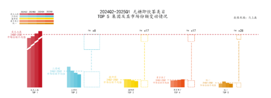 比如2022年才入局的新品牌果子熟了,据官方透露,品牌2024年市场份额实现同比851.07%的增长,仅次于东方树叶、三得利和康师傅。同样的追赶者还有茶小开、让茶、娃哈哈、东鹏饮料等。无糖茶市场也就此从过去的“两强争霸”,转入“一超多强”。