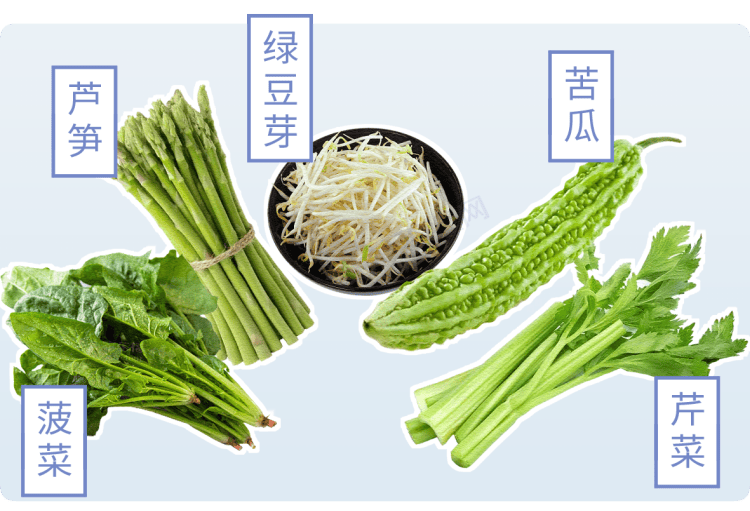 并且要注意和其他蔬菜搭配、轮换食用,以保证营养全面均衡,比如这些食材,也有降肝火功效,大家可以自由搭配组合。