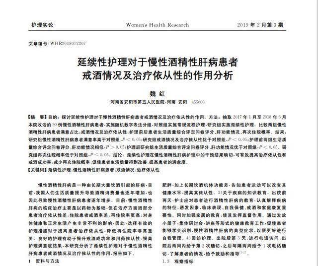 [1]魏红.延续性护理对于慢性酒精性肝病患者戒酒情况及治疗依从性的作用分析[J].中外女性健康研究,2019,(03):144-145.