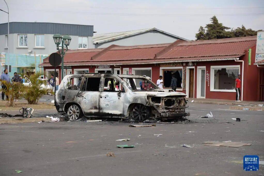 这是9月26日在马达加斯加塔那那利佛商业区拍摄的被损坏的汽车和商铺。新华社发(西塔卡·拉乔纳里松摄)