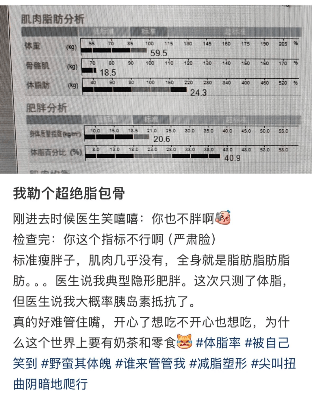 一个瘦瘦的脂包骨,体脂率往往超过上限,肌肉量少得可怜。严重时甚至会变成医学上的“肌肉减少型肥胖”。