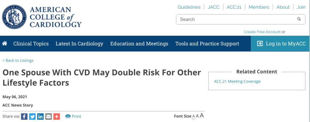 [2]ACC News Story,One Spouse With CVD May Double Risk For Other Lifestyle Factors,2021-05-06,https://www.acc.org/latest-in-cardiology/articles/2021/05/05/14/48/one-spouse-with-cvd-may-double-risk-for-other-lifestyle-factors-acc-2021