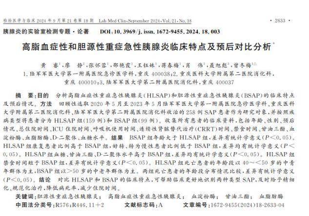 [1]黄睿.高脂血症性和胆源性重症急性胰腺炎临床特点及预后对比分析, 检验医学与临床 ,2024-09-26