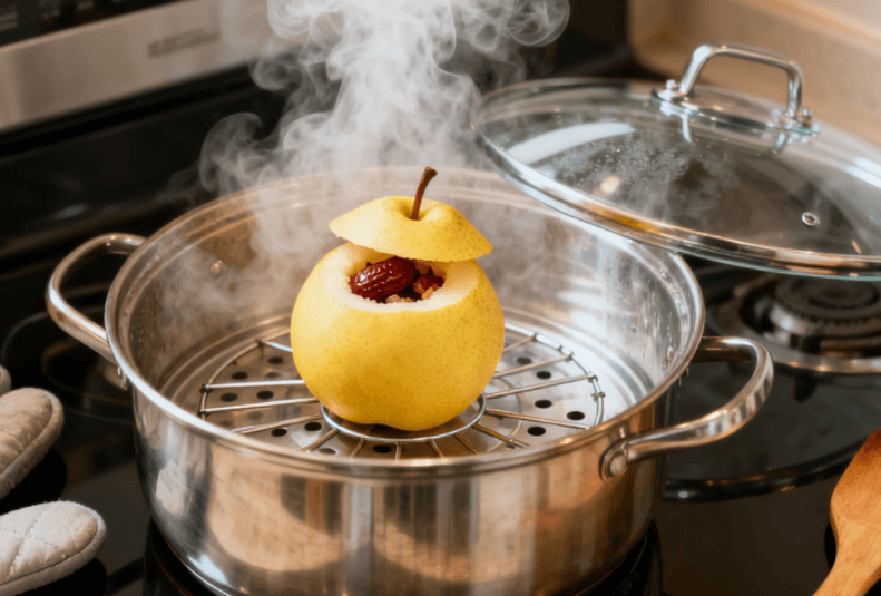 把梨核去掉,往里面塞俩红枣,接下来上锅蒸熟,红枣那甘温的特性,能中和梨的凉性,