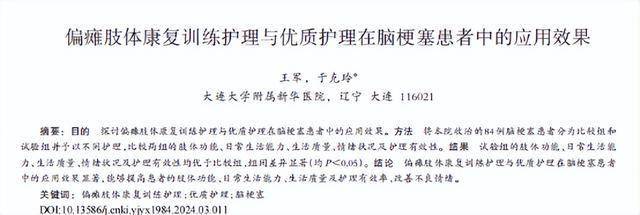 [1]王军.偏瘫肢体康复训练护理与优质护理在脑梗塞患者中的应用效果,中国冶金工业医学杂志,2024-06-04