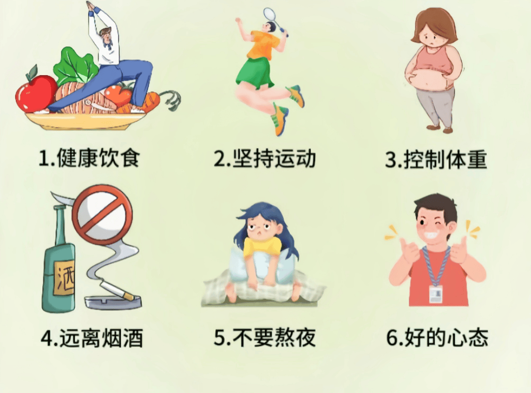 1. 保持健康的生活方式:合理饮食,遵循低盐、低脂、低糖的原则,多吃新鲜蔬菜、水果、全谷类食物,减少动物脂肪、油炸食品、高糖饮料的摄入。适量运动,每周至少进行150分钟的中等强度有氧运动,如快走、慢跑、游泳、骑自行车等,也可以进行适量的力量训练。戒烟限酒,尽量戒烟,避免吸入二手烟;饮酒要适量,男性每天饮酒的酒精量不超过25克,女性不超过15克 。规律作息,保证充足的睡眠,每天睡眠时间7-8小时,避免熬夜和过度劳累。