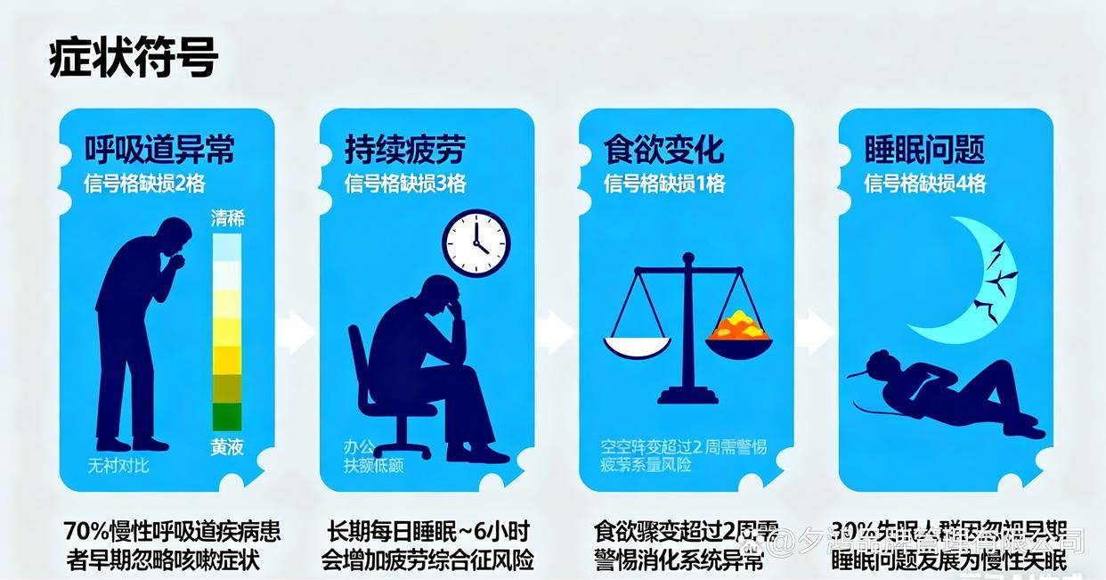 清晨的第一缕阳光照进卧室,你却感觉浑身乏力,仿佛昨晚不是睡了八小时,而是跑了一场马拉松;办公室会议上,你突然控制不住地咳嗽,尴尬得满脸通红;周末与家人散步时,稍稍走快些就气喘吁吁,不得不停下来休息...这些看似普通的“小毛病”,可能是身体在向你发射求救信号。