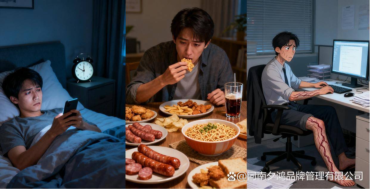 首先,谈谈那些“隐形伤血管”的日常习惯。一是“长期熬夜+睡前刷手机”,熬夜会使身体处于“应激状态”,导致血压升高、血管收缩,而手机蓝光的照射会抑制褪黑素分泌,进一步加重血管负担。二是“偏爱加工食品+喝水少”,加工食品中高盐和添加剂会损伤血管内皮,饮水不足则使血液黏稠度增加,提升血栓形成的风险。三是“久坐不动+缺乏拉伸”,久坐会导致下肢血管受压,血液回流缓慢,容易形成静脉曲张;缺乏拉伸则使肌肉僵硬,进而影响血液循环。