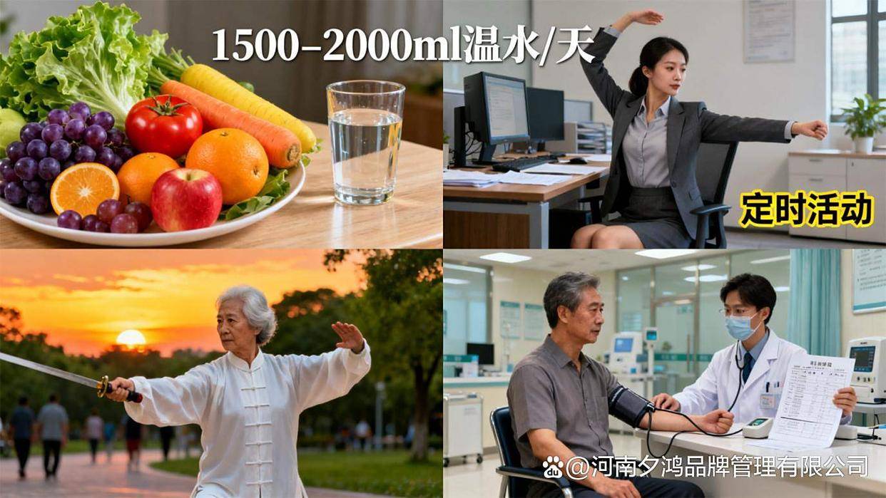 科学的预防和日常养护是“重要防线”。饮食上,应多吃“天然食物”,少吃加工食品,每天饮水量保持在1500至2000毫升温水。运动方面,提倡“碎片化运动+规律锻炼”,上班族需定时活动,傍晚可进行快走,中老年人则适合练习太极剑。日常还需注意“晨起慢动作”。定期检查不可或缺,40岁以上人群每年应进行相关检查,有高血压、糖尿病的患者需定期监测血压和血糖。