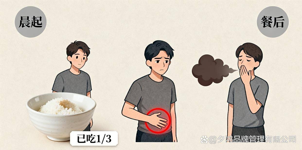 • 细微不适别忽视:吃少量食物就觉 “饱了”(早饱感),比以前食量减少 1/3;餐后偶尔腹痛,多为上腹部隐痛,休息后缓解;口腔异味明显,晨起或餐后更重(胃肠积食、循环差导致代谢废物排出慢)—— 这些看似 “轻微” 的症状,其实是胃肠循环与消化功能异常的早期信号,不能掉以轻心。