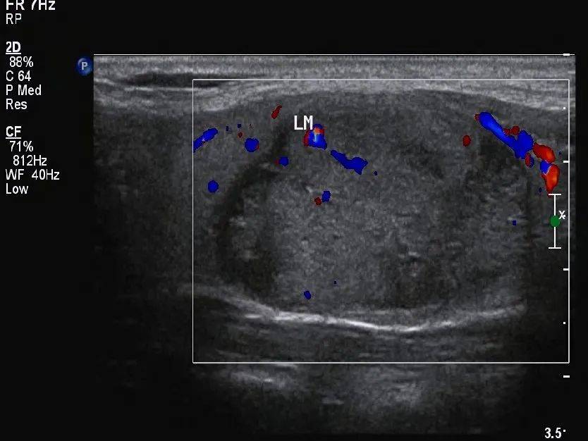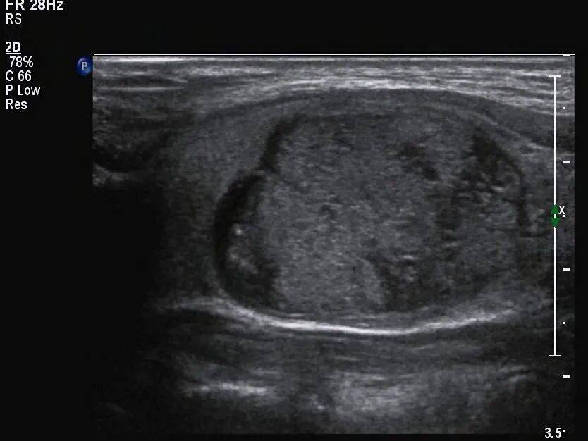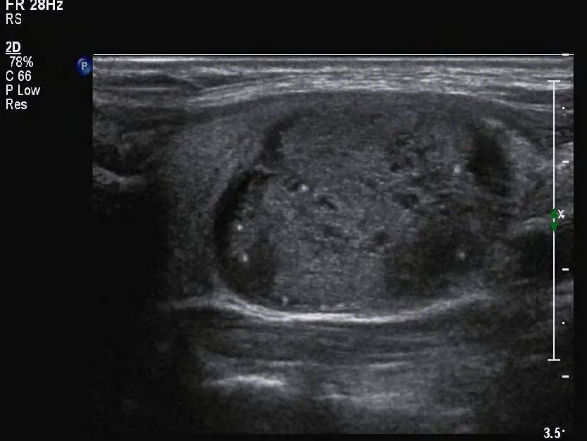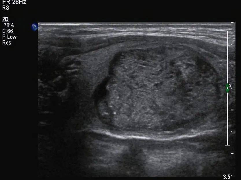 本例中的结节为囊实性结节,需要注意区别囊实性结节和海绵状结节,不是只要看到囊实性成分混合的就是海绵状结节,需注意海绵状结节的定义,结节内部不能有实性成分。