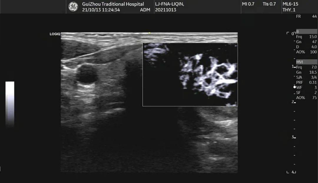 图 1 囊实性结节,以实性为主,内见多个散在分布的点状强回声